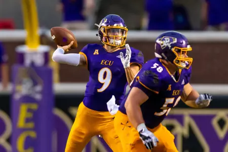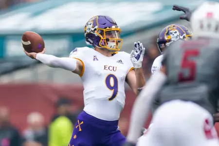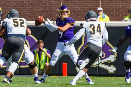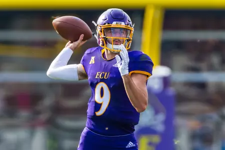 2018: Opened sophomore season as the Piratesā starting signal-caller ⦠Played in nine overall games and made seven starts ā the first six (North Carolina A&T, North Carolina, USF, Old Dominion, Temple, Houston) and the finale at NC State (filling in for an injured Holton Ahlers) ⦠Did not play in contests against UCF, Memphis and Tulane ⦠Completed 154-of-288 passes (53.5 percent) for 1,607 yards and six touchdowns ⦠Averaged 178.6 aerial yards per game ⦠Also credited with 24 rushes for -67 yards ⦠Turned in season-long run of 13 yards vs. the Tar Heels and posted a career-high four rushing attempts four times ⦠Threw for 250 or more yards on four occasions and eclipsed the 300-yard mark twice (had identical 309-yard outings against N.C. A&T and Old Dominion) ⦠Established career-highs in both pass attempts (65) and completions (37) vs. the Aggies in the season opener ⦠Tossed a personal-best three TDs during win against the Monarchs (46, 12 and 4-yarders) ⦠Fired two scoring strikes vs. N.C. A&T (7, 6) before adding a 22-yarder to Trevon Brown the following week vs. North Carolina ⦠Picked off 10 times, twice each in outings vs. the Aggies, Monarchs, Cougars and Bearcats ⦠Earned Pro Football Focus All-AAC weekly honors after leading the Pirates to a 41-19 win over the Tar Heels (19-of-32, 290 yards) ⦠Longest pass completion of season was a 47-yarder (to Brown) at USF ⦠Was 21-of-48 for 253 yards against the Bulls in the American Conference opener ⦠Also surpassed 200 yards vs. Houston (26-of-42, 229) after totaling 112 air yards (17-of-31) at Temple ⦠During first six starts (2-4 record), completed 144-of-260 passes (55.4 percent) for 1,502 yards ā an average of 250.3 ypg ⦠In last three appearances (1-2), which included a start vs. the Wolfpack, was a combined 10-of-28 (35.7) for 105 yards and 0 TDs ā a clip of 35.0 ypg ⦠Completed 8-of-22 passes for 69 yards and was picked off once vs. NC State at Carter-Finley Stadium ⦠Of his 154 completions, 61 went for 10-plus yards (18 exceeded 20 yards) ⦠Booked 977 passing yards (88-of-161) and all six TDs in four non-league games compared to 630 (66-of-127) and no scores in five AAC appearances ⦠Completed 58.6 percent of his passes (106-of-181 for 1,137 yards, 6 TDs) at Dowdy-Ficklen Stadium and only 44.9 percent of road attempts (48-of-107 for 470 yards).