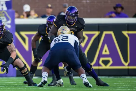 2015: Started 11 of 12 contests at right tackle as a sophomore ⦠Came off the bench in the opener against Towson, but took over position from Dontae Levingston prior to the Florida tilt and did not relinquish job the remainder of the season ⦠Significantly contributed to a unit that averaged 414.6 yards per game, 281.3 through the air (which stood 27th nationally) ⦠Other Top 50 FBS ranks include fourth down conversion percentage (64.7/18th), redzone efficiency (88.6 percent/23rd), third down conversion percentage (43.0/35th) and pass efficiency rating (137.38/43rd) ⦠Helped Pirates amass 400 or more yards six times and 500 or more on three occasions (622/UCF, 555/SMU, 518/BYU) ⦠Member of line that produced a pair of 200-yard rushing efforts (306 vs. SMU, 203 vs. Connecticut) and three individual 100-yard ground performances ā 2/RB Chris Hairston, 1/QB James Summers ⦠Also provided protection for five 300-yard passing outings (473/UCF, 385/BYU, 346/Florida, 325/Navy, 317/Cincinnati).