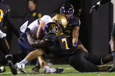 2016: Played in all 12 games, opening five at the āmikeā inside linebacker slot ⦠Made starts in the last five contests of season against Connecticut, Tulsa, SMU, Navy and Temple ⦠Credited with a team-leading 77 tackles (35 solo), 4.0 resulting in lost yardage (two vs. South Carolina/-6 yards, one against UCF/-2 and Connecticut/-2) ⦠Only sack of campaign was against Connecticut at Dowdy-Ficklen Stadium ⦠Also booked a pair of quarterback pressures vs. the Knights and Huskies, while adding a batted pass against UCF in the AAC opener ⦠Produced a pair of double-digit tackle totals (10/Western Carolina and a season-high 12/SMU) ⦠In all, collected two or more stops in 11 outings ⦠Other notable performances came against Connecticut (9 tackles), Tulsa (9), Navy (7), South Carolina (6), Virginia Tech (6), USF (6), UCF (4), Cincinnati (4) and NC State (3) ⦠Led squad with 25 stops (6.3 tpg) in four-game non-conference schedule, while booking 52 (6.5) in eight league tilts ⦠Enjoyed playing at Dowdy-Ficklen Stadium with 45 hits in six contests (7.5 tpg), compared to 32 stops (5.3) in six road battles ⦠Netted 7.0 tackles per outing in second half of season (5.8 in first six games) ⦠A noted run-stopper who netted 81.8 percent of hit total on rushes (63 of 77) ⦠Credited with 13 stops on pass plays and one as a special teams contributor (kickoff return coverage).