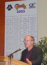 A crowd of greater than 350, including fans, supporters and media, packed the Murphy Center's Harvey Hall to hear Thompson introduce members of his coaching staff and comment on the newly signed recruits. Video highlight clips from ECU's 2002 season as well as highlights of each new recruit were shown on a projection screen. Cheers went up among the standing-room-only crowd as recruits were shown making big hits and nifty offensive moves.