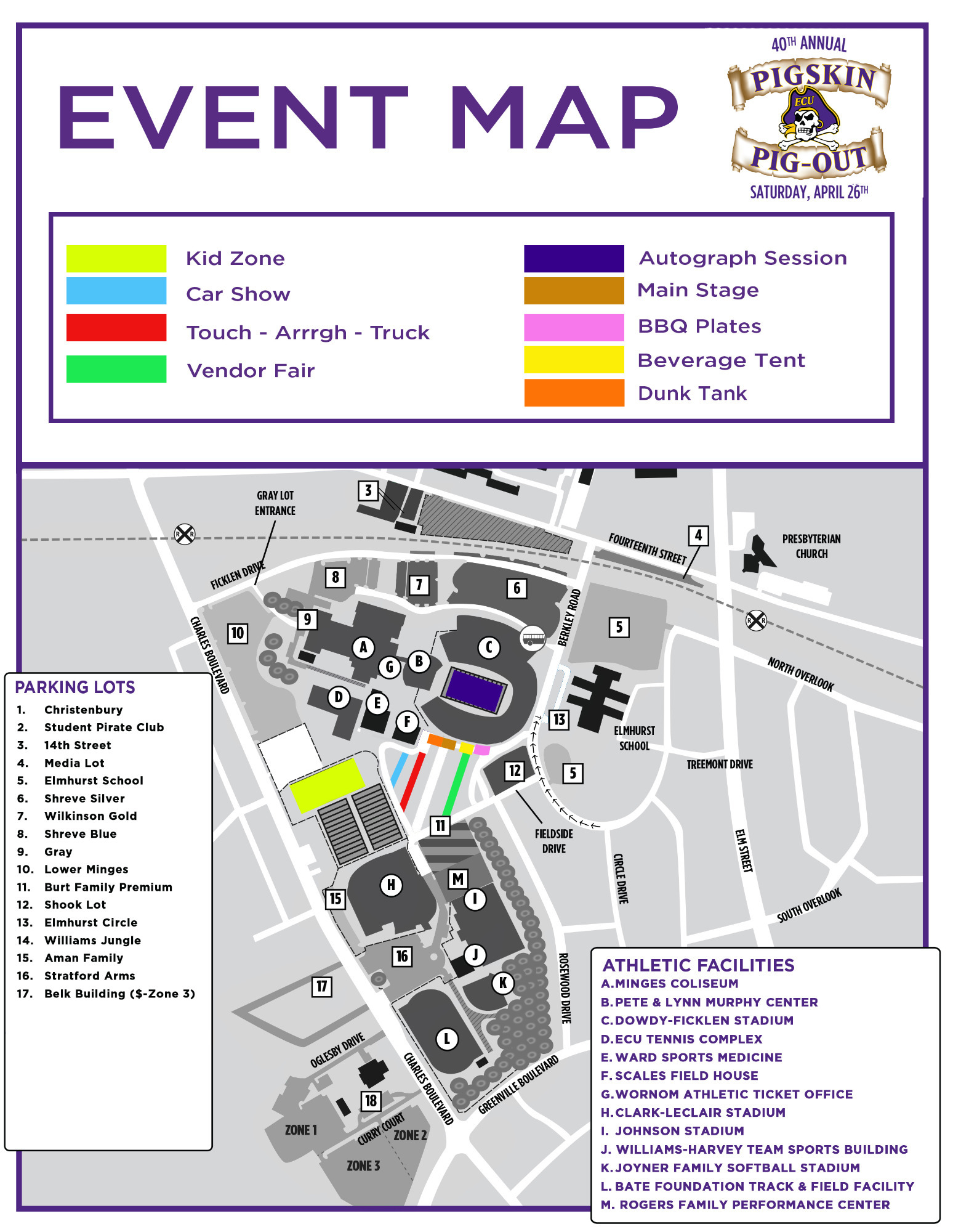 GREENVILLE, N.C. – With the 40th Annual Great Purple/Gold Pigskin Pig-Out, sponsored by Piggly Wiggly, less than a week away, East Carolina fans will have a chance to enjoy the family-oriented festival style event beginning Friday, April 25. The event surrounds the annual ECU Purple-Gold Spring Football Game, which will be played at Dowdy-Ficklen Stadium on Saturday, April 26 at 12 noon. Admission is free to all of Pirate Nation.