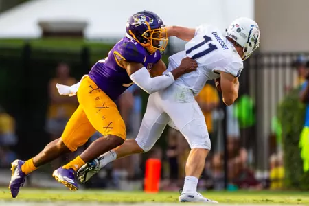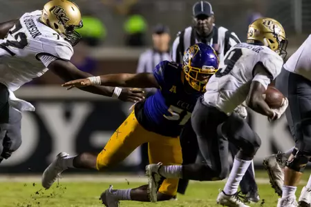 2019: Tallied 32 stops (17 solo) in limited action during junior season … Played in first eight games and made one start (at UCF), but did not appear in final four contests vs. Cincinnati, SMU, Connecticut and Tulsa … Helped Pirates to a defensive scoring average of 28.3 ppg in initial eight outings (in comparison to a 44.4 clip during last four inactive tilts) … Recorded at least two tackles in six contests, which included a career-best 14 successful hits (7 solo) in only start in Orlando against the defending league champion Knights … Also credited with 5.5 TFLs (-15 yards), booking 2.0 in games vs. Gardner-Webb and UCF, along with 1.0 against William & Mary and 0.5 against USF … Logged a pair of sacks for -9 yards (Bulldogs, Tribe) … In addition to double-digit tally vs. UCF, compiled other notable tackle numbers against Gardner-Webb (6), Navy (4), Temple (4), William & Mary (2) and USF (2) … Of the 32 tackles, 29 came on rushing plays, two on passes (sacks) and one on special teams (punt return coverage) … Entered campaign as a Preseason All-American Athletic Conference selection by Phil Steele’s College Football Preview Magazine.