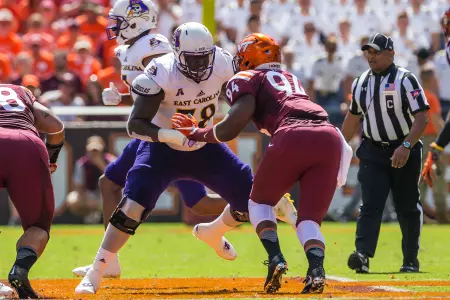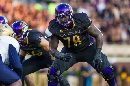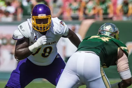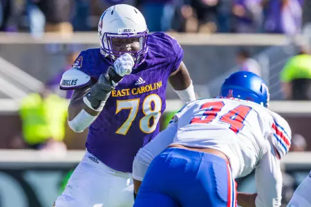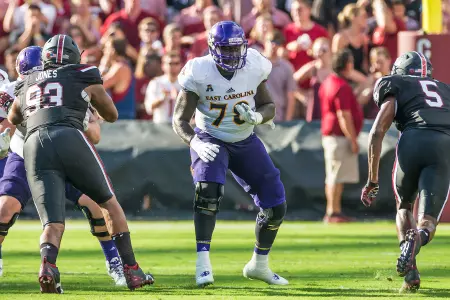 2016: Started all 10 games played in at left tackle … Did not experience action in opener vs. Western Carolina and in first American Athletic Conference clash against UCF … Made first career start vs. NC State at Dowdy-Ficklen Stadium … Helped offensive unit average 467.1 yards per contest, which stood 23rd nationally … Also provided protection for Top 25 ranks in passing offense (6th/334.7), completion percentage (11th/64.8) and fourth down conversion percentage (22nd/60.0) … Supported Top 10 performances for two individuals as WR Zay Jones captured FBS stat titles in receptions (158), receptions per game (13.2) and receiving yards per game (145.5), while QB Philip Nelson was 7th in completion percentage (67.9) and 10th in completions per game (23.7) … Integral part of a Pirate offense that turned in the second-highest single-season passing attack in school history (334.7) and the fourth-highest total offense output (467.1) … Credited with assisting unit’s compilation of 400 or more total yards in nine of 10 contests played … On the ground, opened holes for two 100-yard rushing performances (James Summers/114 vs. USF and 134 vs. Navy).