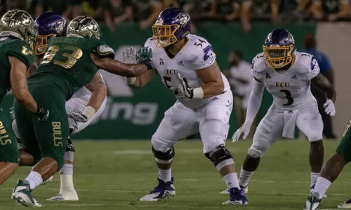 2018: Earned the starting nod at right guard in what was originally deemed his senior season … Opened the first four games against North Carolina A&T, North Carolina, USF and Old Dominion … Season ended prematurely after suffering a second knee injury during the tilt vs. the Monarchs at Dowdy-Ficklen Stadium … Helped Pirates to a 2-2 overall record and the third-highest offensive performance of the year (510 total yards vs. Tar Heels) before being sidelined … ECU also turned its second, third and fourth-highest single-game rushing totals of the season in three of his starts – 220 vs. UNC, 179 vs. ODU and 156 vs. USF – an average of 185.0 rypg.