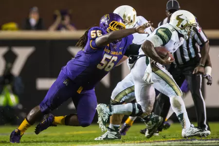 2014: Played in 10 games, making first collegiate start against Connecticut at the end position, opposite Chrishon Rose … Did not experience action against Temple, Cincinnati or Florida (Birmingham Bowl) … Tallied seven tackles (all assists), which included a season-best five against N.C. Central in the season opener … Also collected a pair of stops against the Huskies … Did not record any statistics against South Carolina, Virginia Tech, North Carolina, SMU, USF, Tulane, Tulsa and UCF ... Provided help to a unit that held seven opponents to less than 100 yards rushing (N.C. Central/70, Virginia Tech/91, SMU/51, USF/93, Connecticut/84, Temple/65, Tulane/24) and ranked 11th nationally in rush defense (111.8 ypg) ... Part of Pirate defense that allowed just 32 fourth quarter points in American Athletic Conference action (outscoring opponents 109-32).