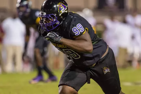 An unselfish, versatile and physical defensive lineman whose development and hard work has resulted in conference honors candidacy as a senior … A Preseason All-American Athletic Conference choice by Athlon Sports (third-team) and Phil Steele Magazine (fourth-team) … A local product who originally earned a roster position as a walk-on in 2012 and initially played the nose tackle position… Designated as one of the Pirates’ starting ends to open the 2016 campaign … Was promoted to full scholarship status during fall camp in 2014 … Has played in 36 career games (14 starts) and booked 98 tackles (45 solo) with 13.0 TFLs, 7.0 sacks and a pair of forced fumbles and recoveries ... Recorded multiple stops 25 times and tallied at least one successful hit in 34 contests … Registered a tackle for lost yardage (-4) during the first spring scrimmage on April 9 and followed with three stops and a forced fumble in the Purple-Gold Game … Continues to exhibit plenty of progress in the weight room, recording lifts of 335 pounds (bench press), 540 (back squat), 308 (power clean) and 264 (push jerk) … Possesses one of the quickest 40 times among all defensive linemen with a 4.77 clip and owns jumps of 29” and 8’9” in the vertical and broad, respectively … Also produced a 55” shot put toss, a 4.66 time in the pro shuttle and a 7.59 clip in the three-cone drill.