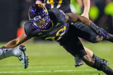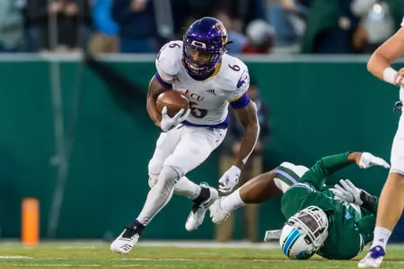 2017: Experienced action in 12 contests and made one start (at Houston) … Led team in rushing with 419 yards on 96 carries (4.4 ypr) … Scored three touchdowns (14-yarder/Connecticut, 25/Tulane, 3/Cincinnati) … TD rush against Green Wave was a career-long … Stood fifth in receiving with 30 receptions for 219 yards (7.3 ypr) … Had a long reception of 23 vs. the Huskies … Opened the season as the Pirates’ top kickoff return specialist, bringing back a 15-yarder against James Madison and a 21-yarder vs. Virginia Tech … Turned in first career triple-digit ground outing with a 108-yard (on 14 carries) performance vs. Tulane … Surpassed 50 yards on two other occasions (12-69/UCF, 9-54/WVU) … Handled the majority of the workload (10-plus carries) four times … Averaged 14.7 rushing attempts per game in the last three contests of the year (14/Tulane, 16/Cincinnati, 14/Memphis) … Made at least one reception in nine games (had multiple-catches six times) … Matched a career-best with five grabs on four occasions (Temple, Houston, Tulane, Memphis) … Top reception yardage totals were a pair of 44-yard afternoons in league matchups against Connecticut and Memphis … Was utilized more noticeably in the passing game towards the end of the season, averaging 4.8 receptions and 32.5 yards per outing in the last four contests (Houston, Tulane, Cincinnati, Memphis) compared to 1.4 and 11.1 clips during the first eight games … Topped the Pirates’ rushing attack in various categorical splits – AAC games (72-324), home (56-214), road (40-205), second half of season (64-298), night (37-208), November (45-205) … Overall, recorded six plays of 20-plus yards (four rushes, one reception, one kickoff return) … Accounted for 18 first down rushes … Stood second among all special teams tacklers with seven stops (five solo) … Booked two hits each in contests vs. Virginia Tech, USF and BYU … Made five stops on kickoff returns, two on punt returns.